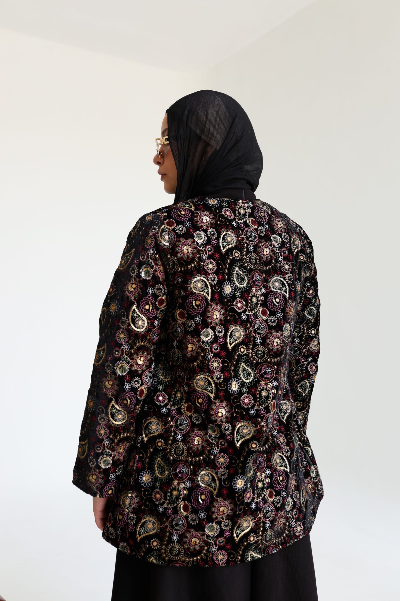This Jacket made from luxurious Indian fabric, this piece features rich, multicolored embroidery for a unique look. The open-front cut offers a refined drape, perfect for special occasions or elevating your everyday style.
