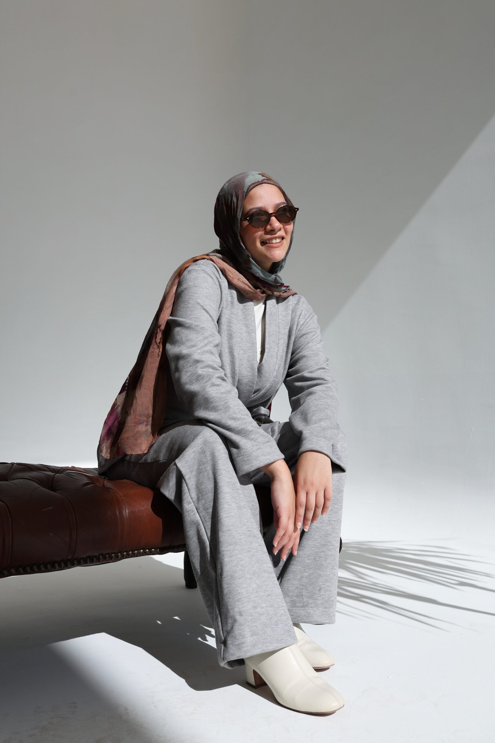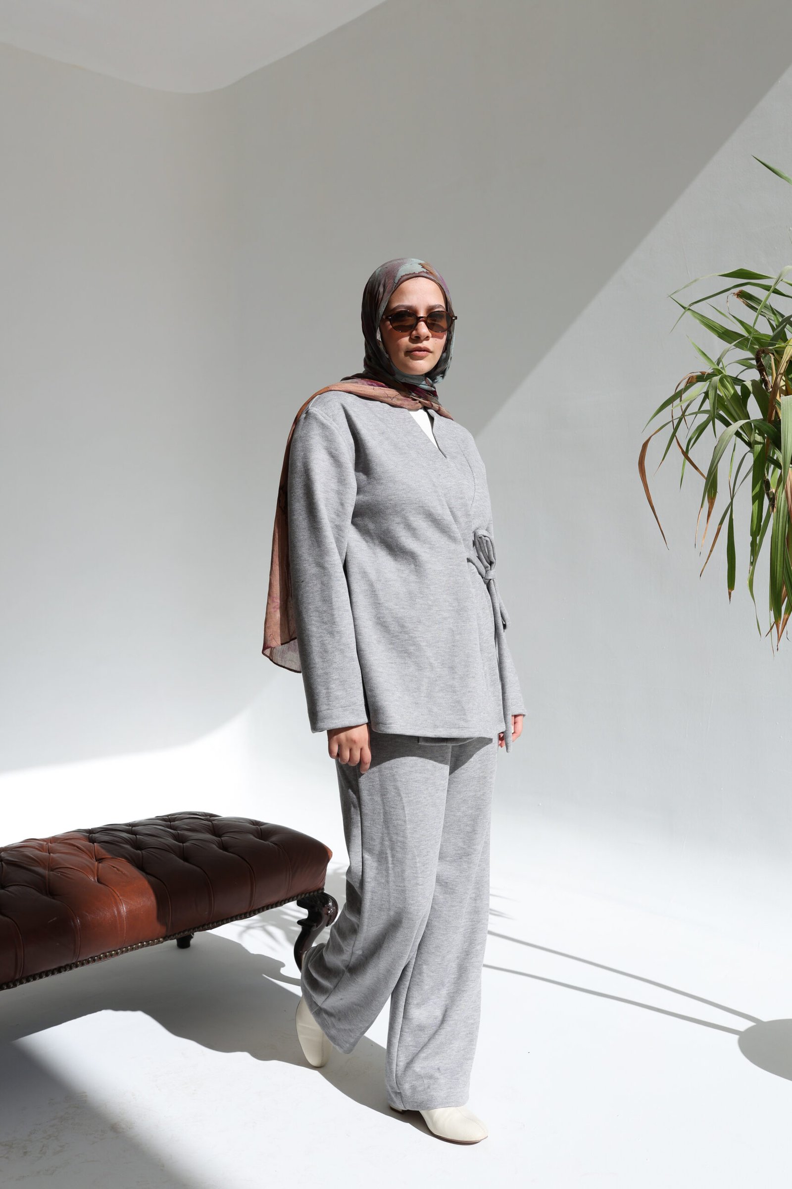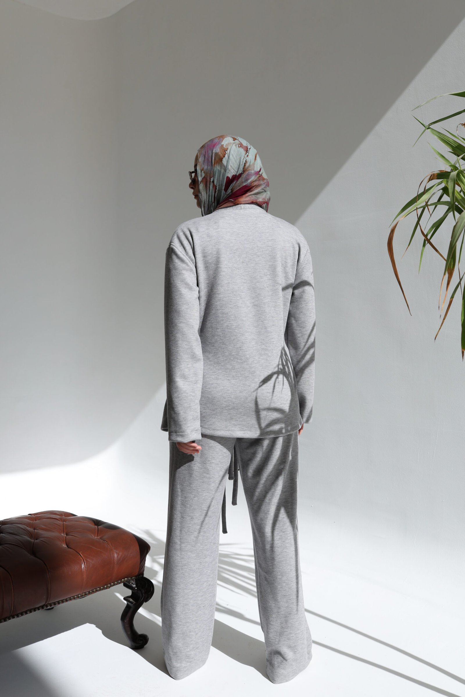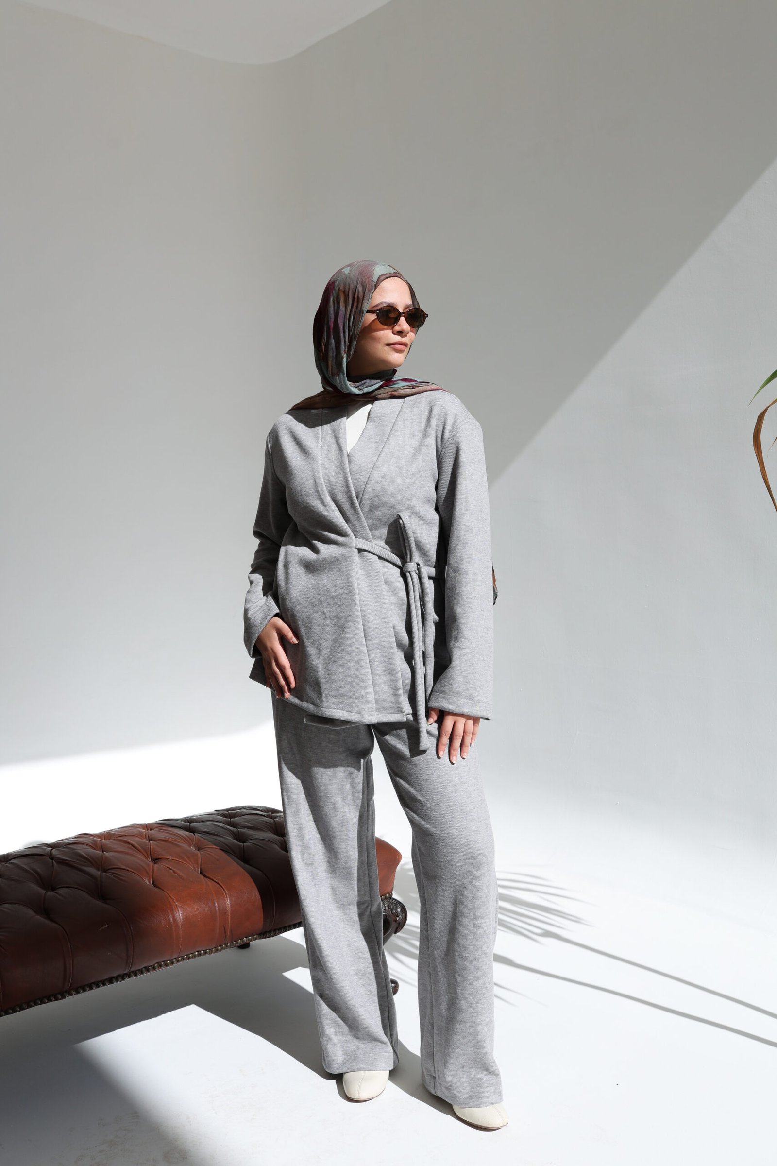 This two-piece ensemble in light grey redefines cozy elegance. The set features a soft wrap-style cardigan that cinches at the waist with a tie belt, paired with matching straight-leg trousers for maximum comfort. Crafted from a pleasant, soft-flowing fabric, it is the ideal companion for relaxing days or a stylish, modest lounge look.