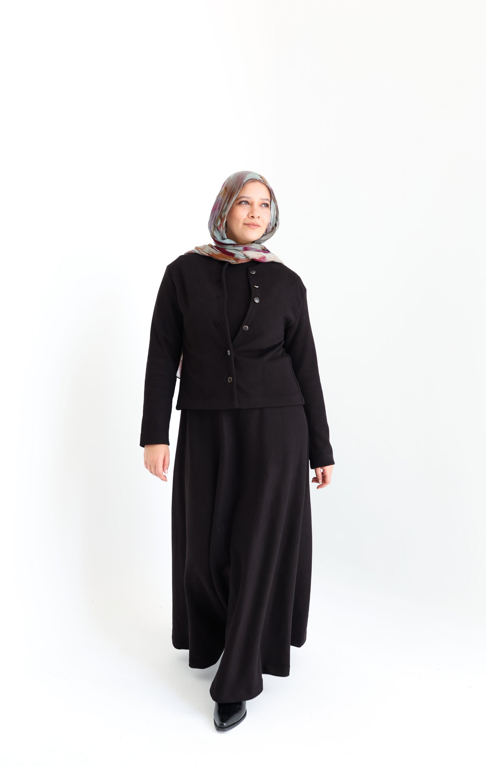 One set, two looks, infinite comfort. This ensemble features a sleek basic dress that stands strong on its own as a wardrobe essential. Layer it with the matching button-down cardigan, and the look instantly transforms into one of refined elegance. Crafted from incredibly soft fabric, it feels luxurious against the skin—making it the ultimate blend of cozy and chic.